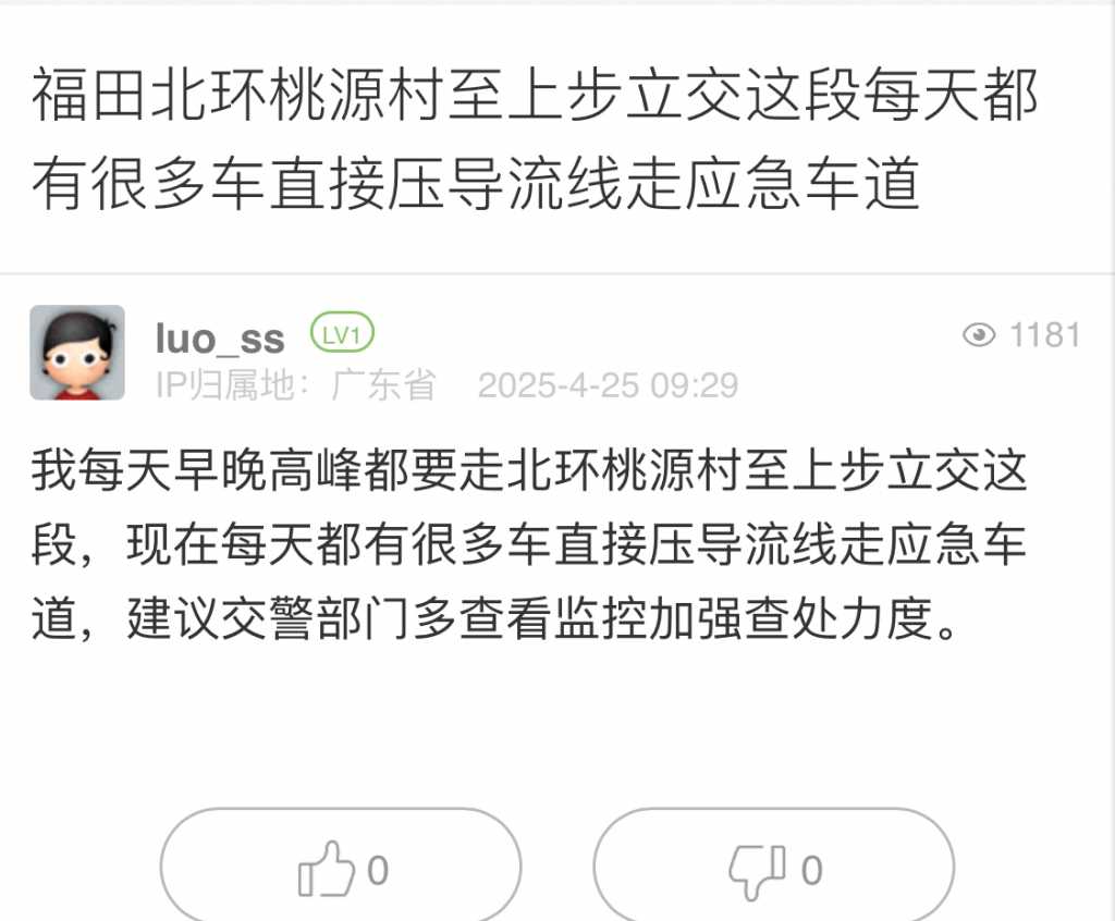 19. 帖文《福田北环桃源村至上步立交这段每天都有很多车直接压导流线走应急车道》