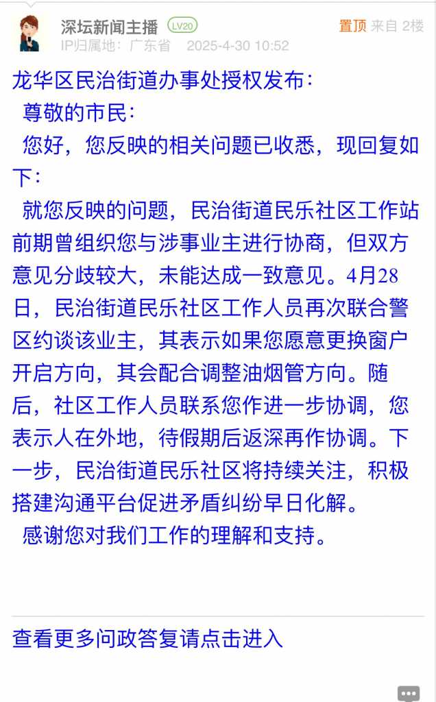就您反映的问题,民治街道民乐社区工作站前期曾组织您与涉事业主进行协商,但双方意见分歧较大,未能达成一致意见。4月28日,民治街道民乐社区工作人员再次联合警区约谈该业主,其表示如果您愿意更换窗户开启方向,其会配合调整油烟管方向。随后,社区工作人员联系您作进一步协调,您表示人在外地,待假期后返深再作协调。下一步,民治街道民乐社区将持续关注,积极搭建沟通平台促进矛盾纠纷早日化解。