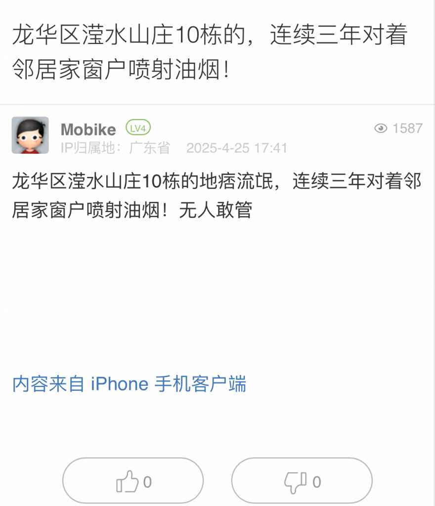 15. 帖文《龙华区滢水山庄10栋的,连续三年对着邻居家窗户喷射油烟!》