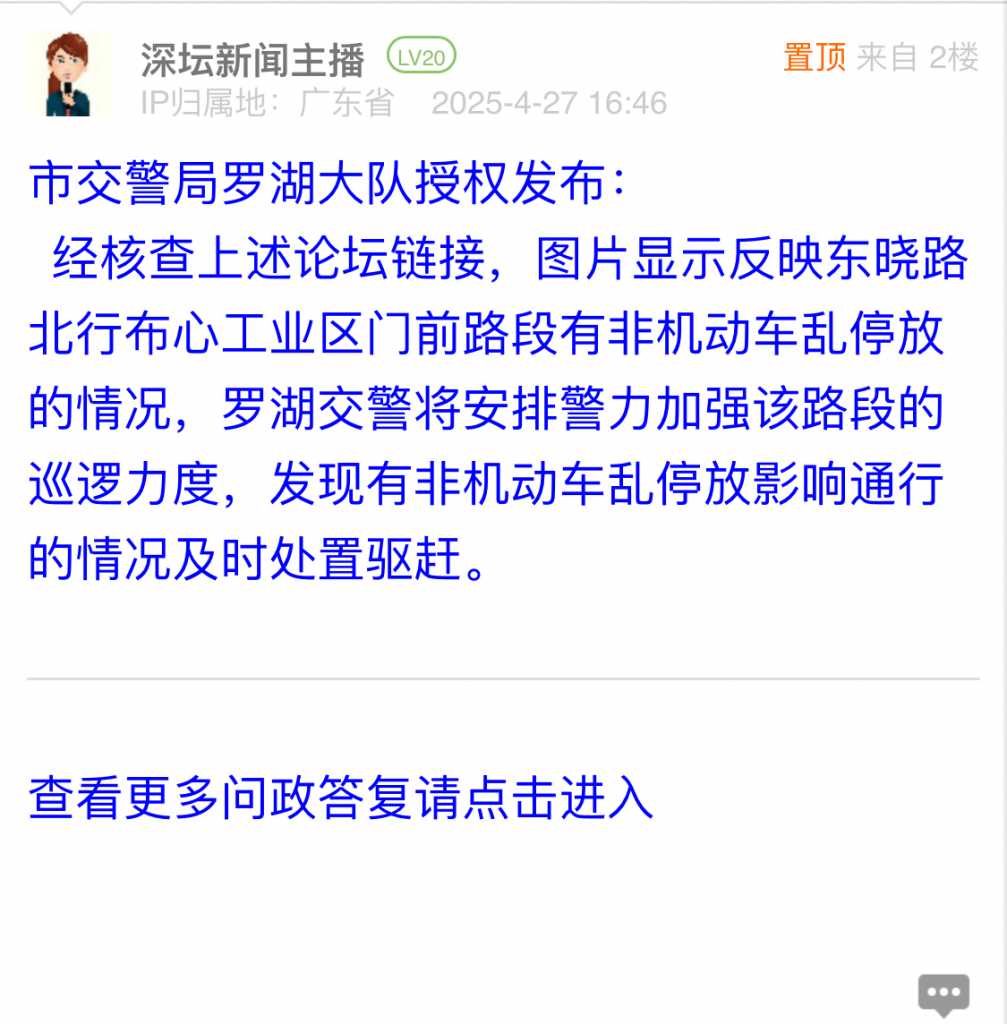 经核查上述论坛链接,图片显示反映东晓路北行布心工业区门前路段有非机动车乱停放的情况,罗湖交警将安排警力加强该路段的巡逻力度,发现有非机动车乱停放影响通行的情况及时处置驱赶。