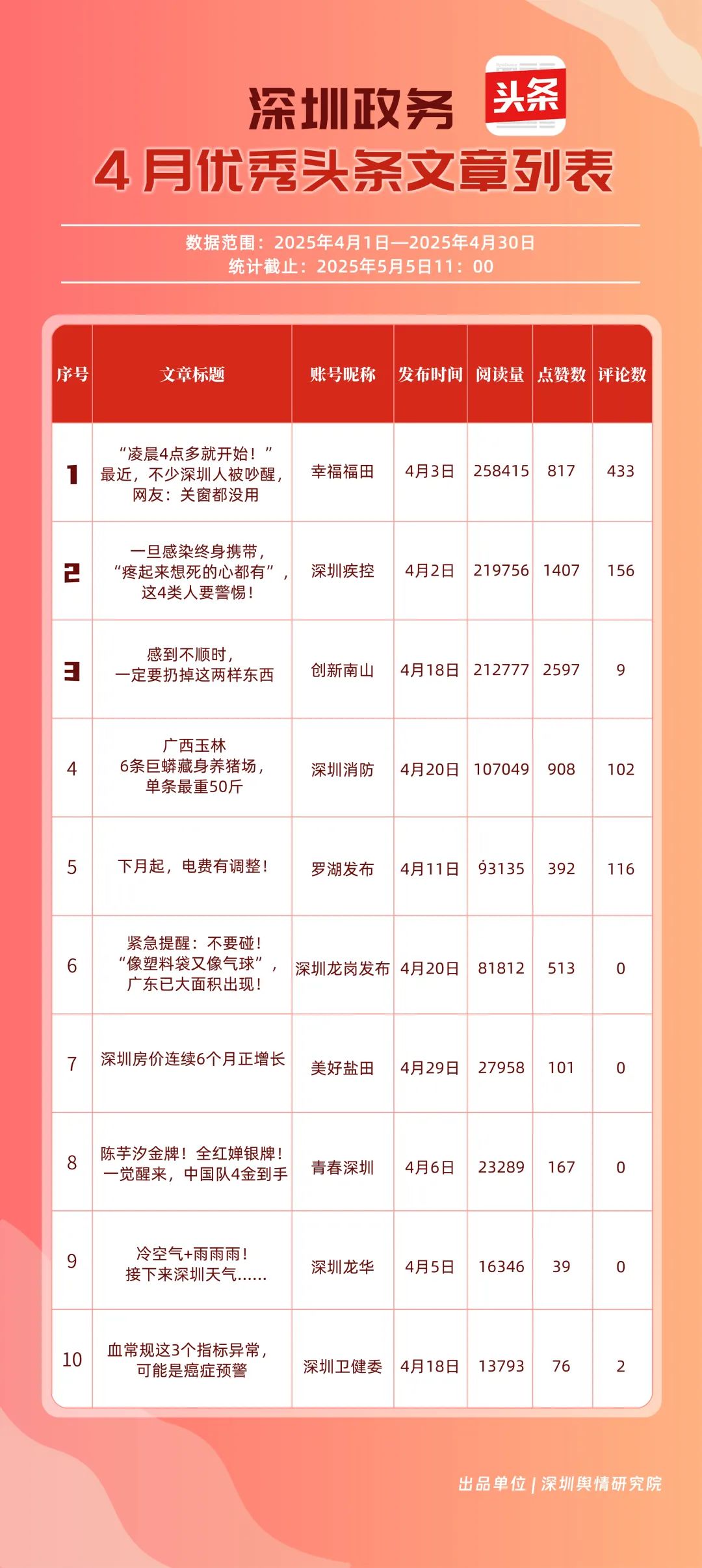 4月,“幸福福田”“深圳疾控”“创新南山”“深圳消防”“罗湖发布”“深圳龙岗发布”“坪山发布”“深圳龙华”“青春深圳”“滨海宝安”共10个政务头条号入选“优秀政务头条号”榜单。“幸福福田”延续上月的优异表现,以优质的内容输出和稳定的用户互动,位列榜单首位,成为政务头条号的标杆;“深圳疾控”则以92.39分的亮眼成绩排在榜单第二位,凸显了政务新媒体在公共卫生领域的传播成果;“创新南山”“深圳消防”“罗湖发布”紧随其后,分别在城区形象宣传、消防安全领域等方面深耕细作,持续扩大政务信息的覆盖面与影响力。