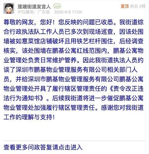 尊敬的网友,您好!您反映的问题已收悉。我街道综合行政执法队工作人员已多次到现场巡查,因该处围墙被如意菜馆店铺破坏且用铁艺栏杆围住,后经调查核实,该处围墙在鹏基公寓红线范围内,鹏基公寓物业管理处负责日常维护管养。因此我街道执法人员约谈了深圳市鹏基物业管理服务有限公司相关部门人员,并给深圳市鹏基物业管理服务有限公司鹏基公寓物业管理处开具了履行辖区管理责任的《责令改正违法行为通知书》。后续我街道将进一步催促鹏基公寓物业管理处加强履行辖区管理责任。感谢您对我街道工作的理解与支持!