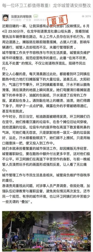 9. 帖文《每一位环卫工都值得尊重!龙华城管请安排整改》