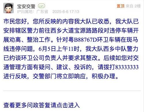 市民您好,您所反映的内容我大队已收悉,我大队已安排辖区警力前往西乡大道宝源路路段对违停车辆开展劝离、整治工作。针对粤B88767D环卫车辆在斑马线违停问题,6月5日上午11时,我大队西乡中队警力已约谈环卫公司负责人并要求其整改。后续如您对交通管理方面有疑问、建议、投诉的,请拨打83333333进行反映,交警部门将立即响应,积极办理。