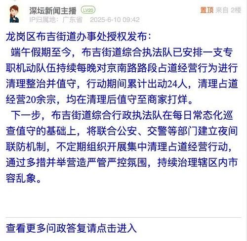 端午假期至今,布吉街道综合执法队已安排一支专职机动队伍持续每晚对京南路路段占道经营行为进行清理整治并值守,行动期间累计出动24人,清理占道经营20余宗,均在清理后值守至商家打烊。