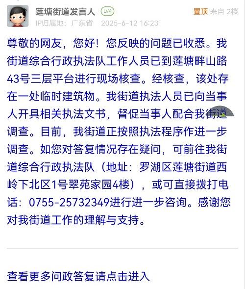 尊敬的网友,您好!您反映的问题已收悉。我街道综合行政执法队工作人员已到莲塘畔山路43号三层平台进行现场核查。经核查,该处存在一处临时建筑物。我街道执法人员已向当事人开具相关执法文书,督促当事人配合我街道调查。目前,我街道正按照执法程序作进一步调查。如您对答复情况存在疑问,可前往我街道综合行政执法队(地址:罗湖区莲塘街道西岭下北区1号翠苑家园4楼),或可直接拨打电话:0755-25732349进行进一步咨询。感谢您对我街道工作的理解与支持。