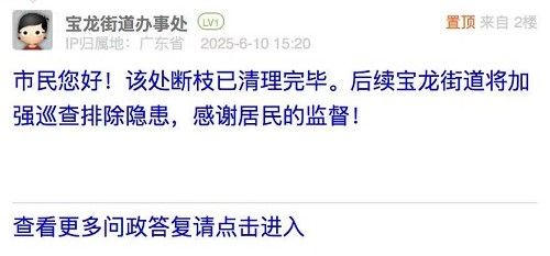市民您好!该处断枝已清理完毕。后续宝龙街道将加强巡查排除隐患,感谢居民的监督!