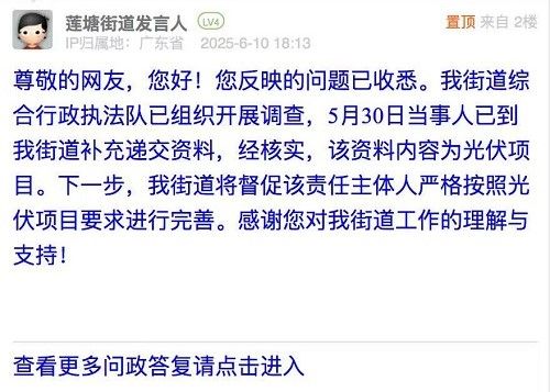 尊敬的网友,您好!您反映的问题已收悉。我街道综合行政执法队已组织开展调查,5月30日当事人已到我街道补充递交资料,经核实,该资料内容为光伏项目。下一步,我街道将督促该责任主体人严格按照光伏项目要求进行完善。感谢您对我街道工作的理解与支持!