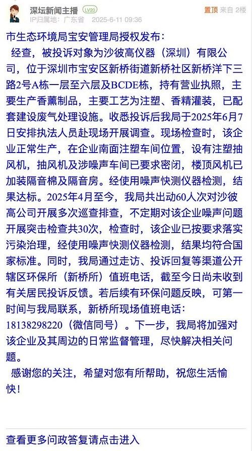 经查,被投诉对象为沙彼高仪器(深圳)有限公司,位于深圳市宝安区新桥街道新桥社区新桥洋下三路2号A栋一层至六层及BCDE栋,持有营业执照,主要生产香薰制品,主要工艺为注塑、香精灌装,已配套建设废气处理设施。收悉投诉后我局于2025年6月7日安排执法人员赴现场开展调查。现场检查时,该企业正常生产,在企业南面注塑车间位置,设有注塑抽风机,抽风机及涉噪声车间已要求密闭,楼顶风机已加装隔音棉及隔音房。经使用噪声快测仪器检测,结果达标。2025年4月至今,我局共出动60人次对沙彼高公司开展多次巡查排查,不定期对该企业噪声问题开展突击检查共30次,检查时,该企业已按要求落实污染治理,经使用噪声快测仪器检测,结果均符合国家标准。同时,我局通过走访、投诉回复等渠道公开辖区环保所(新桥所)值班电话,截至今日尚未收到有关居民投诉反馈。若后续有环保问题反映,可第一时间与我局联系,新桥所现场值班电话:18138298220(微信同号)。下一步,我局将加强对该企业及其周边的日常监督管理,尽快解决相关问题。