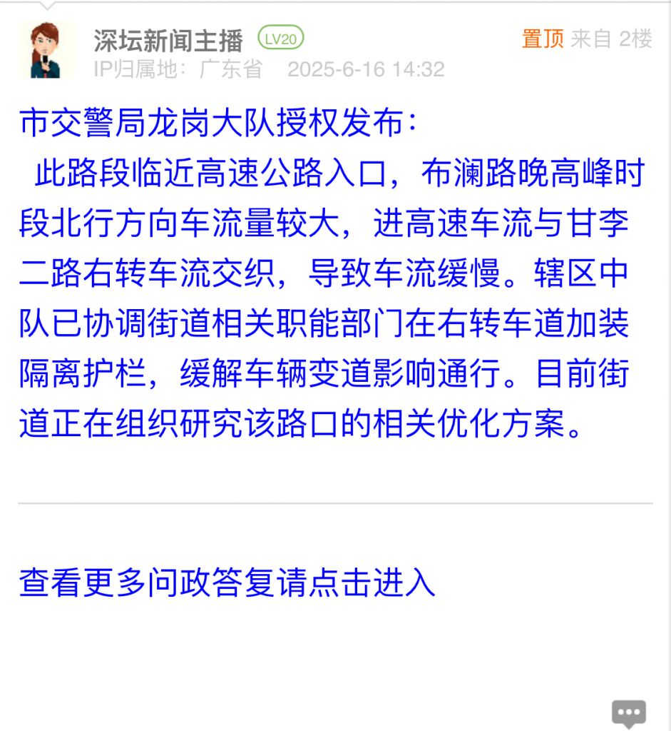 据统计,2025年6月9日-2025年6月15日,网友在深圳论坛发布问政类帖文共32篇,得到相关单位正式回应的帖文数为28篇,本期简报回应速度最快的单位:市交警局福田大队、宝安区教育局、市交警局龙华大队、市交警局龙岗大队。
