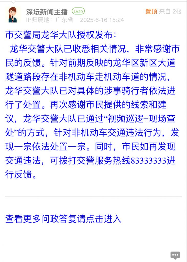 14. 帖文《龙华隧道每天大量电动自行车随意穿插,投诉几次没人管》