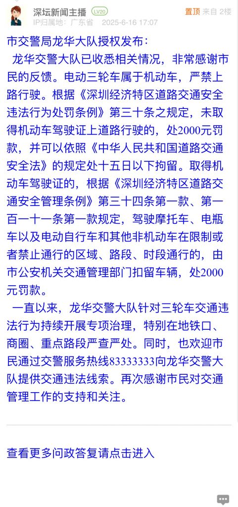 龙华交警大队已收悉相关情况,非常感谢市民的反馈。电动三轮车属于机动车,严禁上路行驶。根据《深圳经济特区道路交通安全违法行为处罚条例》第三十条之规定,未取得机动车驾驶证上道路行驶的,处2000元罚款,并可以依照《中华人民共和国道路交通安全法》的规定处十五日以下拘留。取得机动车驾驶证的,根据《深圳经济特区道路交通安全管理条例》第三十四条第一款、第一百一十一条第一款规定,驾驶摩托车、电瓶车以及电动自行车和其他非机动车在限制或者禁止通行的区域、路段、时段通行的,由市公安机关交通管理部门扣留车辆,处2000元罚款。