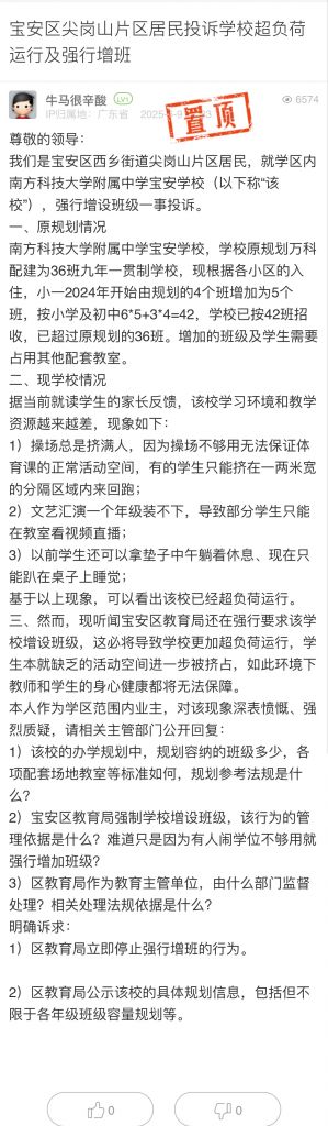 3. 帖文《宝安区尖岗山片区居民投诉学校超负荷运行及强行增班》《宝安区尖岗山片区居民投诉学校超负荷运行》《宝安区尖岗山片区居民投诉学校超负荷运行》