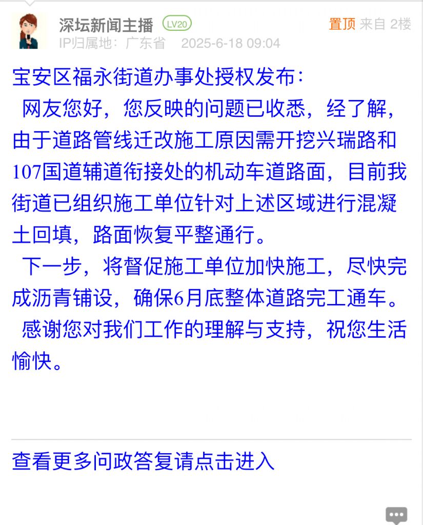 19. 帖文《宝安福永107国道凤凰花苑段与兴益路交叉路口,市政施工地砖一个月没有回填,给行人带来安全隐患和出行困难》