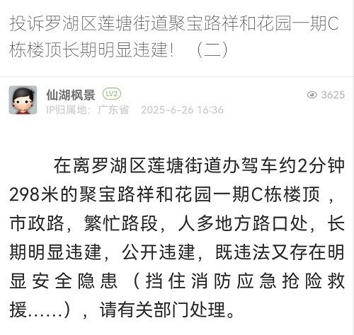 13. 帖文《投诉罗湖区莲塘街道聚宝路祥和花园一期C栋楼顶长期明显违建!(二)》