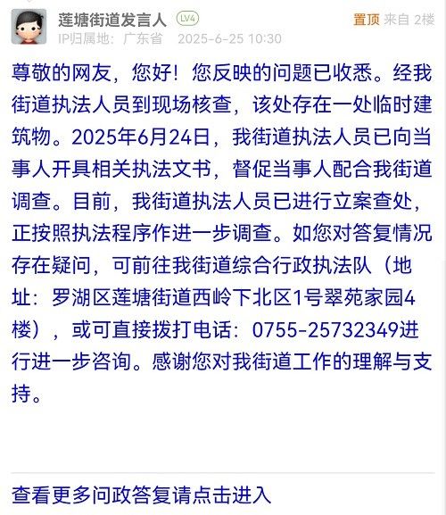 尊敬的网友,您好!您反映的问题已收悉。经我街道执法人员到现场核查,该处存在一处临时建筑物。2025年6月24日,我街道执法人员已向当事人开具相关执法文书,督促当事人配合我街道调查。目前,我街道执法人员已进行立案查处,正按照执法程序作进一步调查。如您对答复情况存在疑问,可前往我街道综合行政执法队(地址:罗湖区莲塘街道西岭下北区1号翠苑家园4楼),或可直接拨打电话:0755-25732349进行进一步咨询。感谢您对我街道工作的理解与支持。