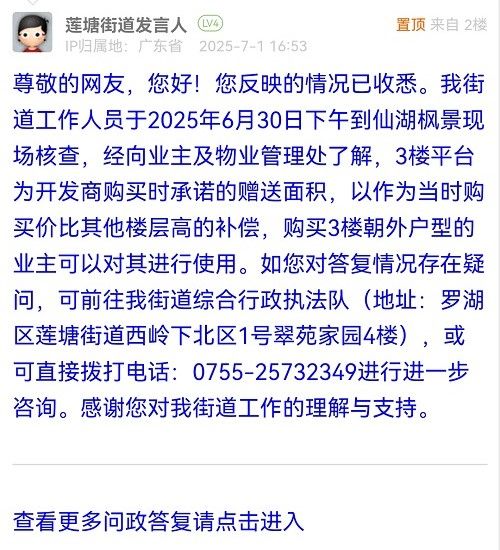 尊敬的网友,您好!您反映的情况已收悉。我街道工作人员于2025年6月30日下午到仙湖枫景现场核查,经向业主及物业管理处了解,3楼平台为开发商购买时承诺的赠送面积,以作为当时购买价比其他楼层高的补偿,购买3楼朝外户型的业主可以对其进行使用。如您对答复情况存在疑问,可前往我街道综合行政执法队(地址:罗湖区莲塘街道西岭下北区1号翠苑家园4楼),或可直接拨打电话:0755-25732349进行进一步咨询。感谢您对我街道工作的理解与支持。