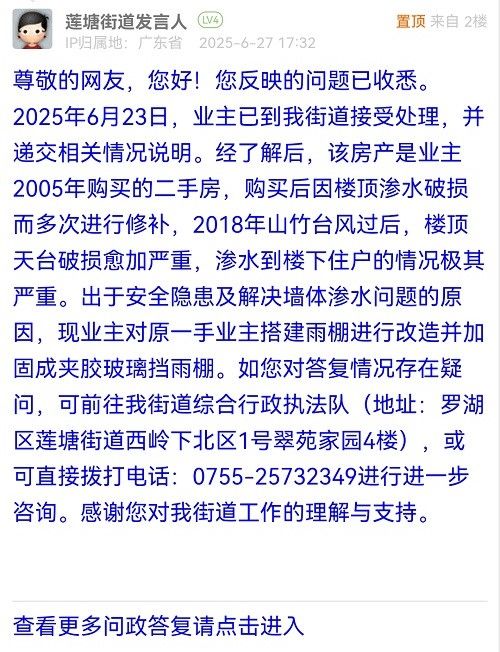 尊敬的网友,您好!您反映的问题已收悉。2025年6月23日,业主已到我街道接受处理,并递交相关情况说明。经了解后,该房产是业主2005年购买的二手房,购买后因楼顶渗水破损而多次进行修补,2018年山竹台风过后,楼顶天台破损愈加严重,渗水到楼下住户的情况极其严重。出于安全隐患及解决墙体渗水问题的原因,现业主对原一手业主搭建雨棚进行改造并加固成夹胶玻璃挡雨棚。如您对答复情况存在疑问,可前往我街道综合行政执法队(地址:罗湖区莲塘街道西岭下北区1号翠苑家园4楼),或可直接拨打电话:0755-25732349进行进一步咨询。感谢您对我街道工作的理解与支持。