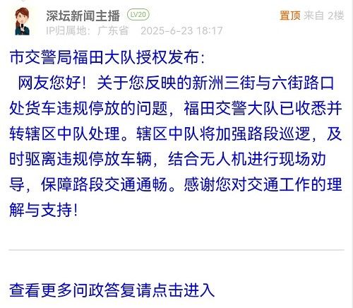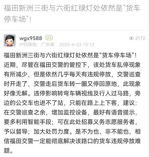 5. 帖文《福田新洲三街与六街红绿灯处依然是“货车停车场”!》