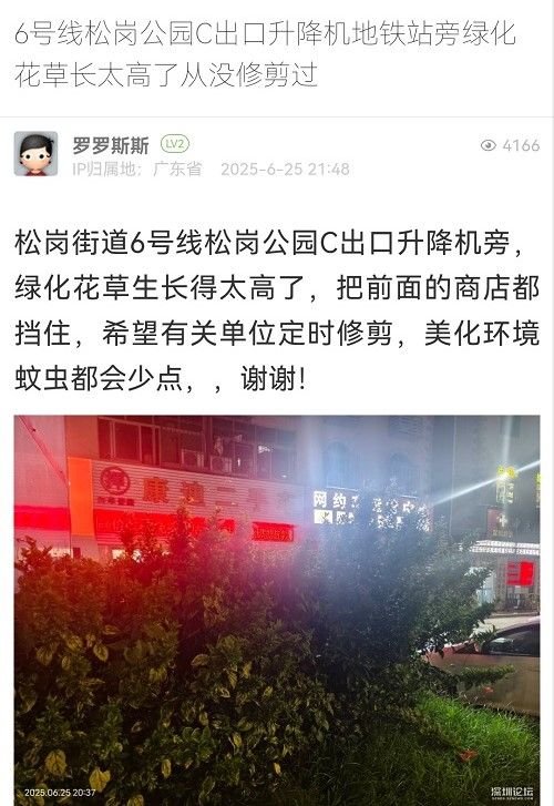 9. 帖文 《6号线松岗公园C出口升降机地铁站旁绿化花草长太高了从没修剪过》