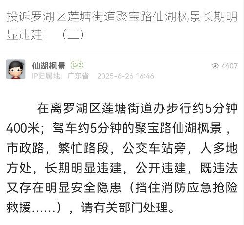 14. 帖文《投诉罗湖区莲塘街道聚宝路仙湖枫景长期明显违建!(二)》