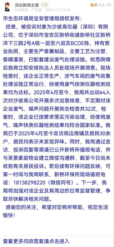 经查,被投诉对象为沙彼高仪器(深圳)有限公司,位于深圳市宝安区新桥街道新桥社区新桥洋下三路2号A栋一层至六层及BCDE栋,持有营业执照,主要生产香薰制品,主要工艺为注塑、香精灌装,已配套建设废气处理设施。收悉舆情后我局立即安排执法人员赴现场开展调查。现场检查时,该企业正常生产,涉气车间的废气收集处理设施正常运行,经使用废气快测仪器检测结果均为达标。2025年4月至今,我局共出动64人次对沙彼高公司开展多次巡查排查,不定期对该企业废气、噪声问题开展突击检查共32次,检查时,该企业已按要求落实污染治理,经使用废气、噪声快测仪器检测结果均符合国家标准。我局已于2025年4月至今走访周边商铺及居民30余户,居民均表示未发现异味。同时,我局通过走访、投诉回复等渠道已公开新桥所值班电话,并与芙景豪庭物业建立微信沟通群,截至今日尚未收到有关居民投诉。若后续有环保问题反映,可第一时间与我局联系,新桥环保所现场值班电话:18138298220(微信同号)。下一步,我局将加强对该企业及其周边的日常监督管理,争取尽快解决相关问题。