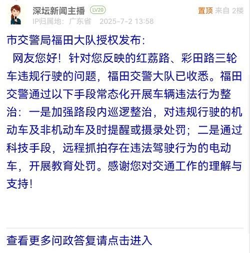 网友您好!针对您反映的红荔路、彩田路三轮车违规行驶的问题,福田交警大队已收悉。福田交警通过以下手段常态化开展车辆违法行为整治:一是加强路段内巡逻整治,对违规行驶的机动车及非机动车及时提醒或摄录处罚;二是通过科技手段,远程抓拍存在违法驾驶行为的电动车,开展教育处罚。感谢您对交通工作的理解与支持!