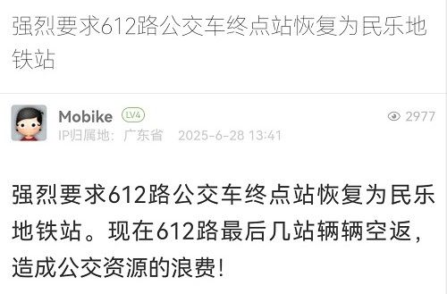 19. 帖文《强烈要求612路公交车终点站恢复为民乐地铁站》