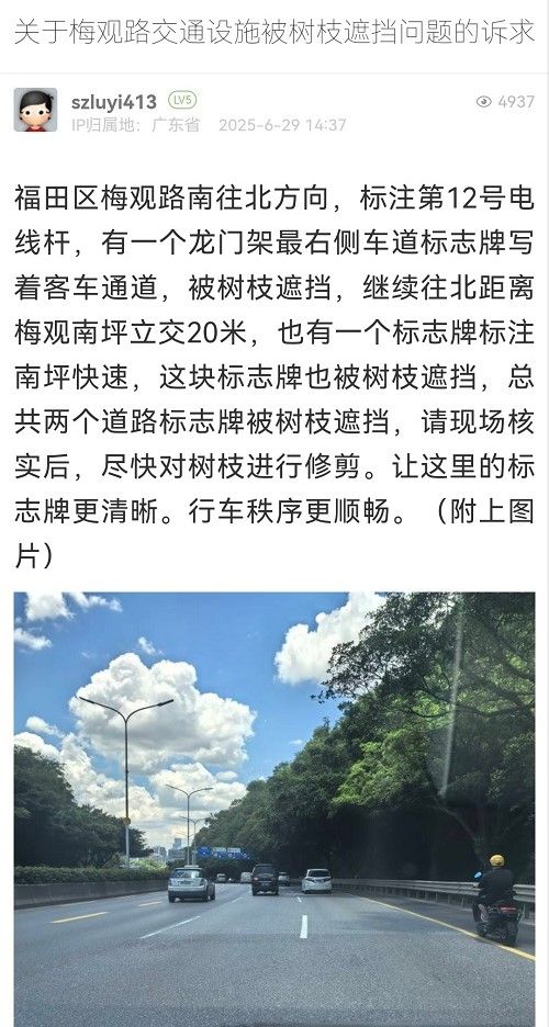27. 帖文《关于梅观路交通设施被树枝遮挡问题的诉求》