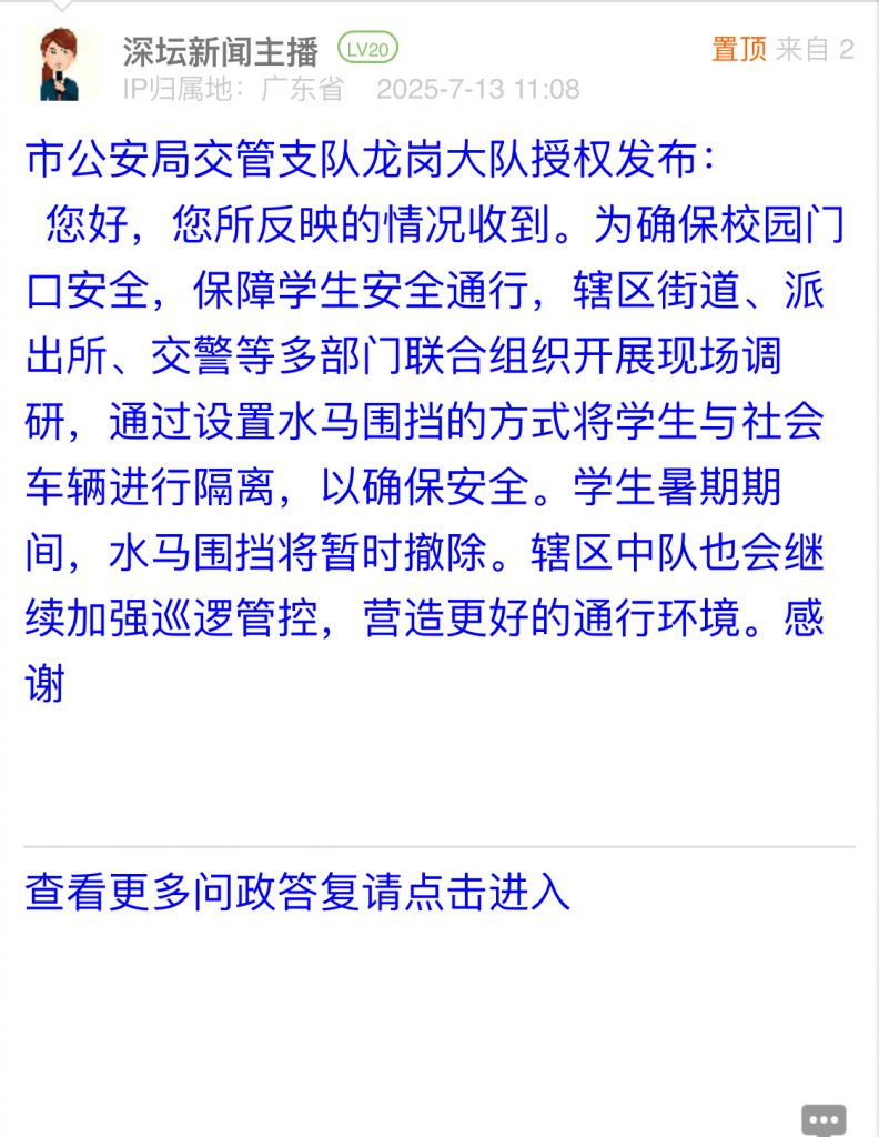 您好,您所反映的情况收到。为确保校园门口安全,保障学生安全通行,辖区街道、派出所、交警等多部门联合组织开展现场调研,通过设置水马围挡的方式将学生与社会车辆进行隔离,以确保安全。学生暑期期间,水马围挡将暂时撤除。辖区中队也会继续加强巡逻管控,营造更好的通行环境。感谢