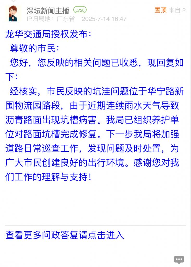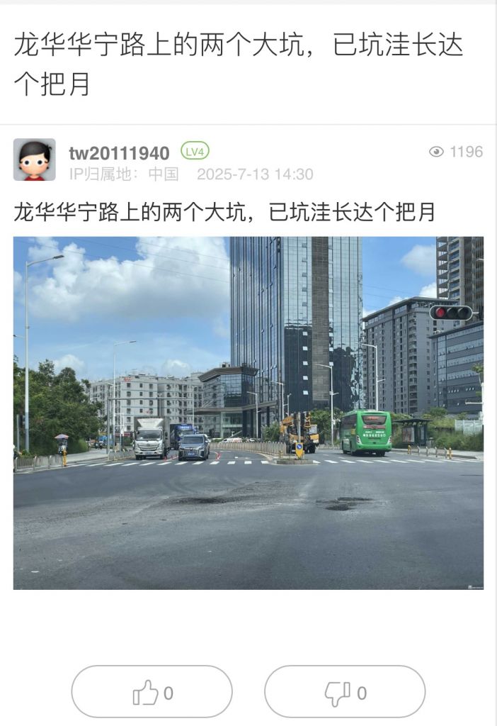 28. 帖文《龙华华宁路上的两个大坑,已坑洼长达个把月》
