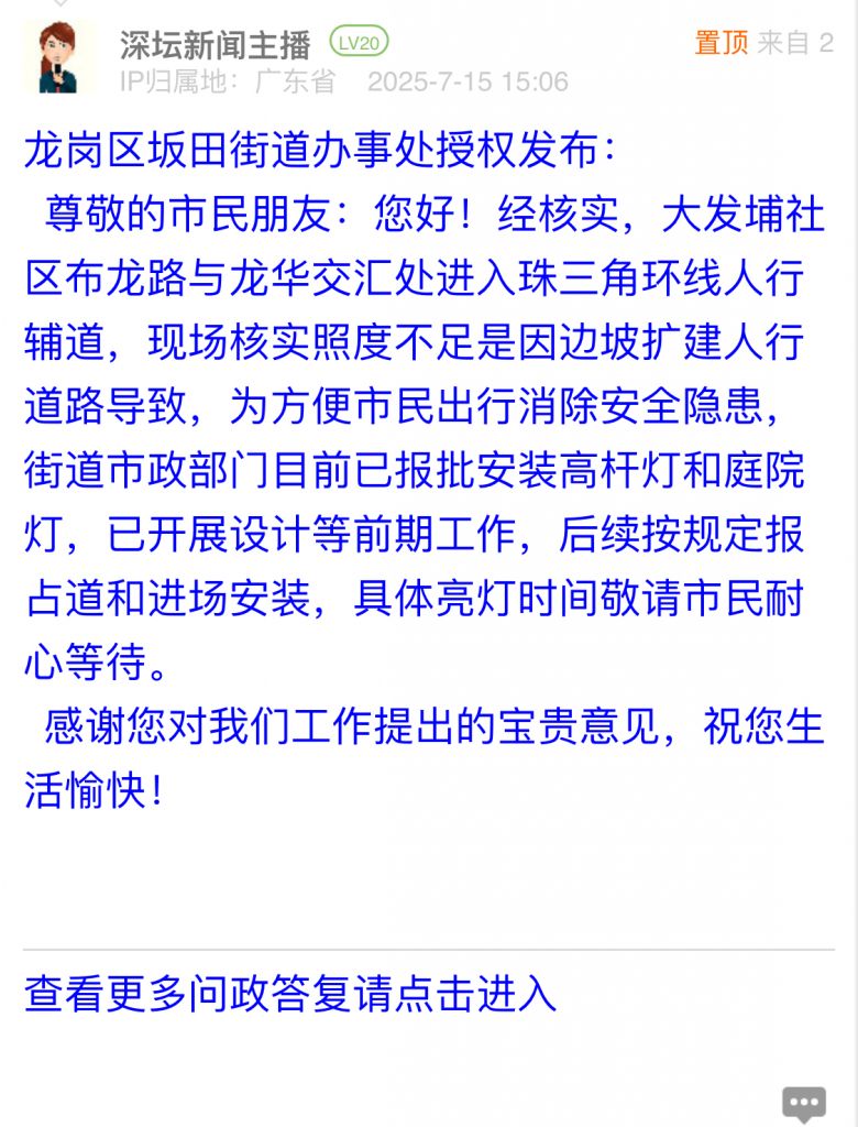 尊敬的市民朋友:您好!经核实,大发埔社区布龙路与龙华交汇处进入珠三角环线人行辅道,现场核实照度不足是因边坡扩建人行道路导致,为方便市民出行消除安全隐患,街道市政部门目前已报批安装高杆灯和庭院灯,已开展设计等前期工作,后续按规定报占道和进场安装,具体亮灯时间敬请市民耐心等待。