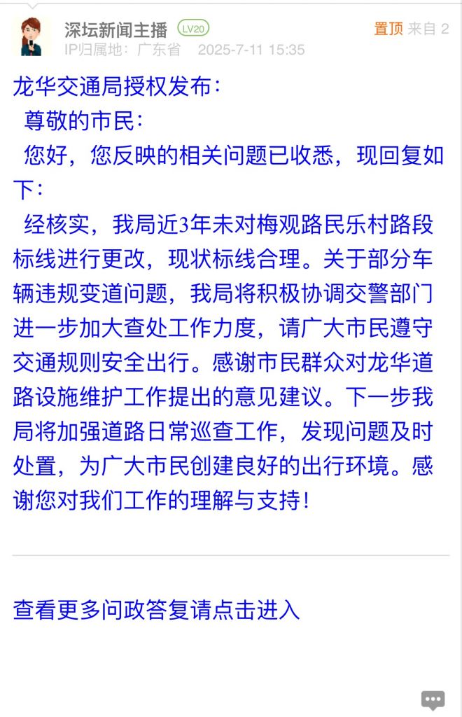 经核实,我局近3年未对梅观路民乐村路段标线进行更改,现状标线合理。关于部分车辆违规变道问题,我局将积极协调交警部门进一步加大查处工作力度,请广大市民遵守交通规则安全出行。感谢市民群众对龙华道路设施维护工作提出的意见建议。下一步我局将加强道路日常巡查工作,发现问题及时处置,为广大市民创建良好的出行环境。感谢您对我们工作的理解与支持!