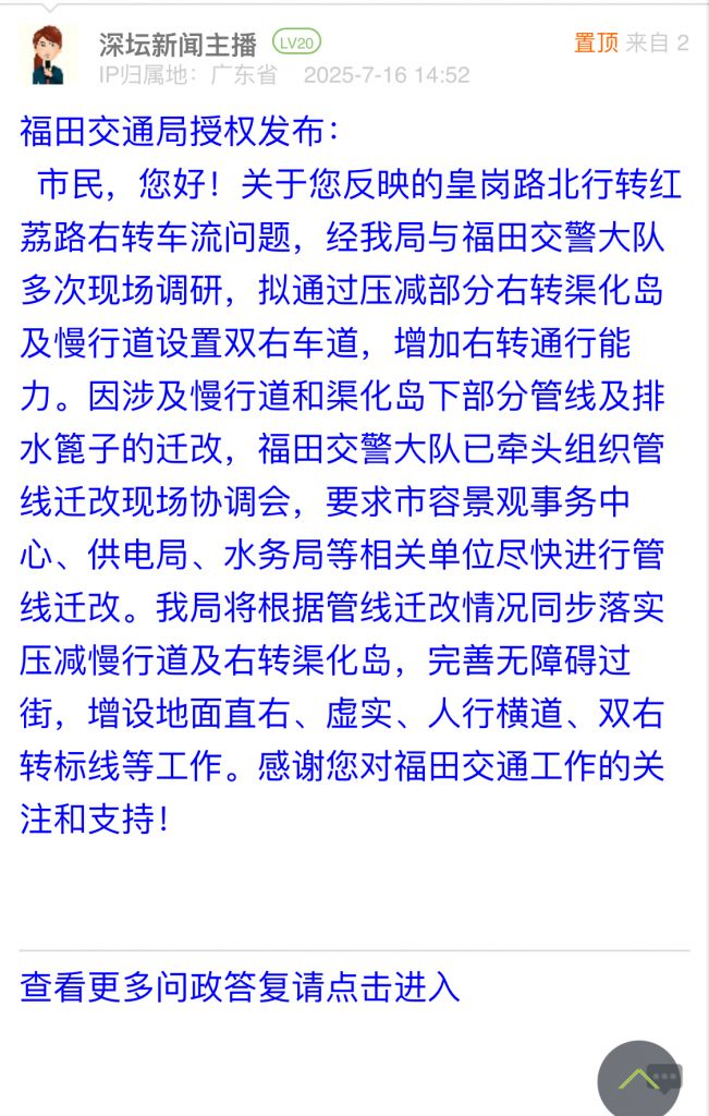 市民,您好!关于您反映的皇岗路北行转红荔路右转车流问题,经我局与福田交警大队多次现场调研,拟通过压减部分右转渠化岛及慢行道设置双右车道,增加右转通行能力。因涉及慢行道和渠化岛下部分管线及排水篦子的迁改,福田交警大队已牵头组织管线迁改现场协调会,要求市容景观事务中心、供电局、水务局等相关单位尽快进行管线迁改。我局将根据管线迁改情况同步落实压减慢行道及右转渠化岛,完善无障碍过街,增设地面直右、虚实、人行横道、双右转标线等工作。感谢您对福田交通工作的关注和支持!