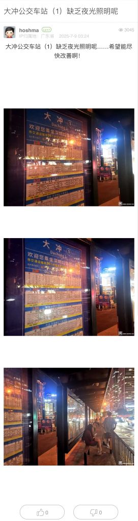 34. 帖文《大冲公交车站(1)缺乏夜光照明呢》