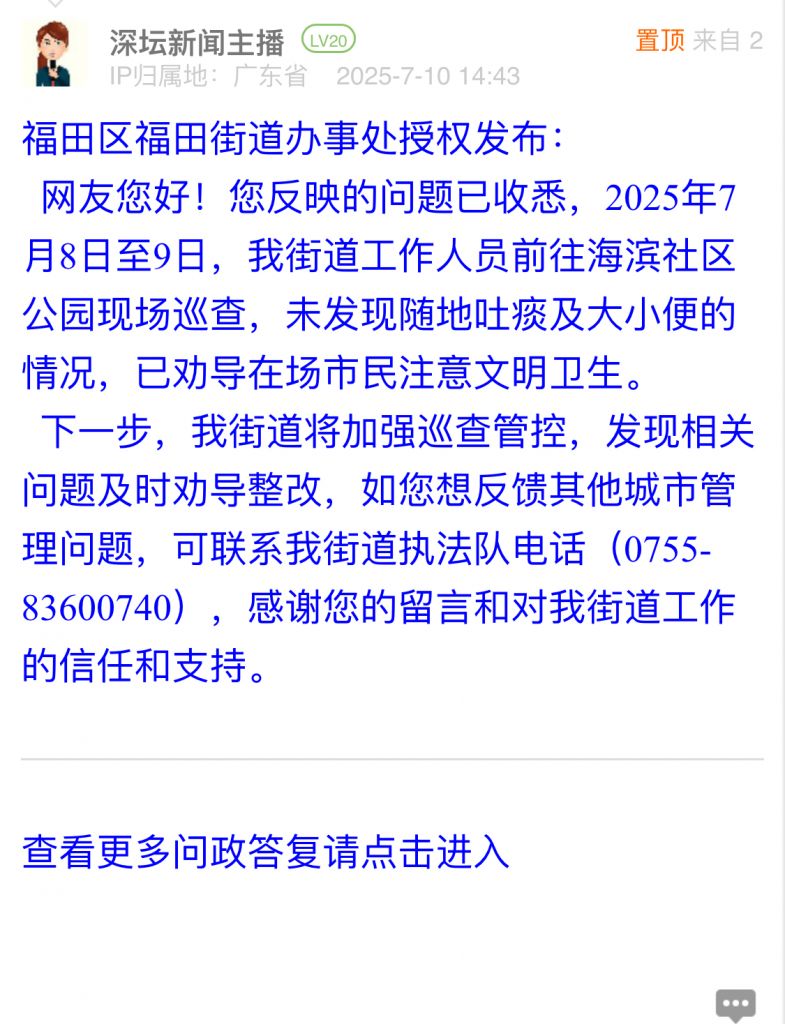 网友您好!您反映的问题已收悉,2025年7月8日至9日,我街道工作人员前往海滨社区公园现场巡查,未发现随地吐痰及大小便的情况,已劝导在场市民注意文明卫生。