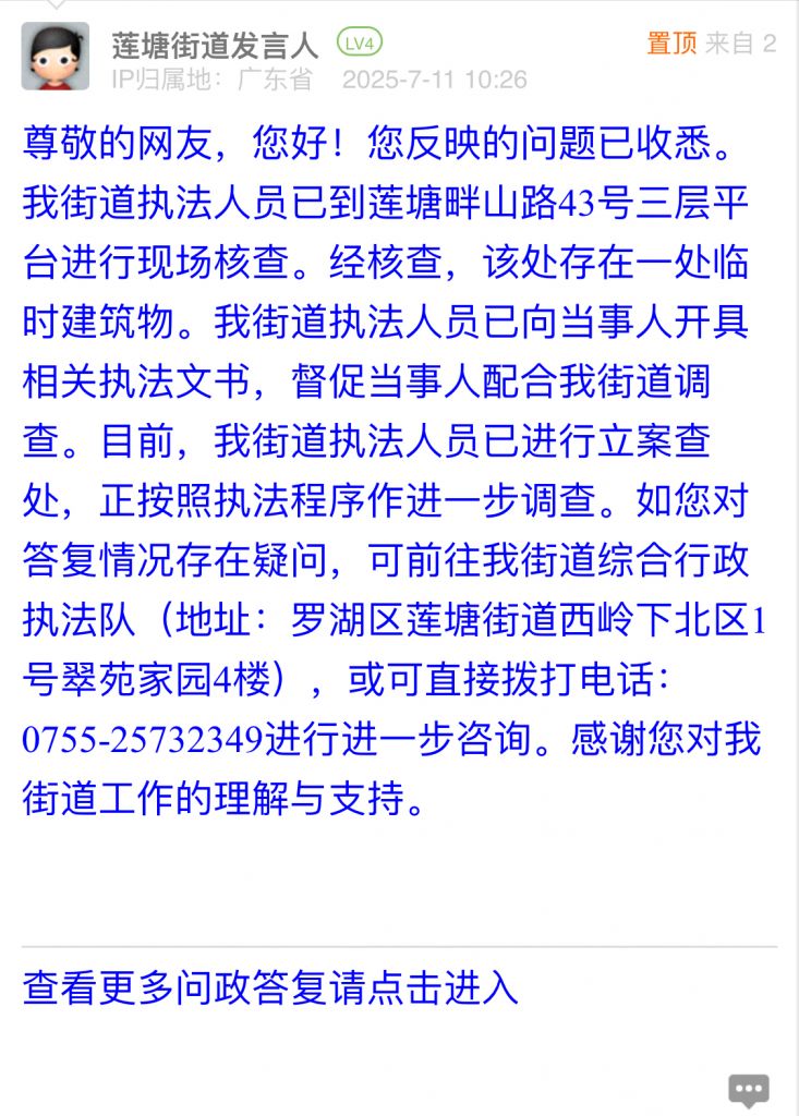 尊敬的网友,您好!您反映的问题已收悉。我街道执法人员已到莲塘畔山路43号三层平台进行现场核查。经核查,该处存在一处临时建筑物。我街道执法人员已向当事人开具相关执法文书,督促当事人配合我街道调查。目前,我街道执法人员已进行立案查处,正按照执法程序作进一步调查。如您对答复情况存在疑问,可前往我街道综合行政执法队(地址:罗湖区莲塘街道西岭下北区1号翠苑家园4楼),或可直接拨打电话:0755-25732349进行进一步咨询。感谢您对我街道工作的理解与支持。