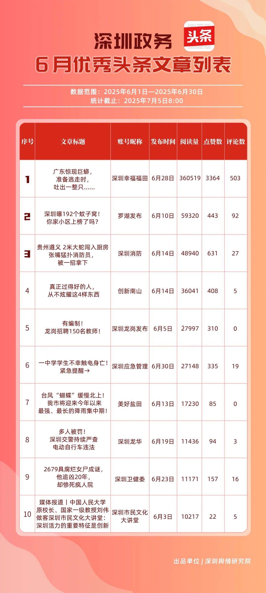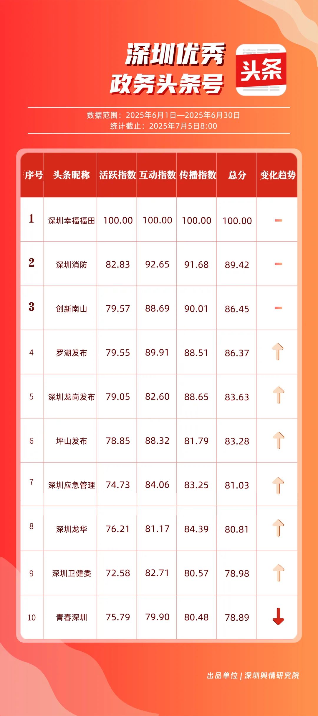 2025年6月期《深圳优秀政务新媒体矩阵》正式发布,邀您一同关注政务新媒体领域的标杆典范,它们凭借精准高效的传播效能与独具匠心的创新实践脱颖而出,共同构建起深圳政务传播的全新生态。