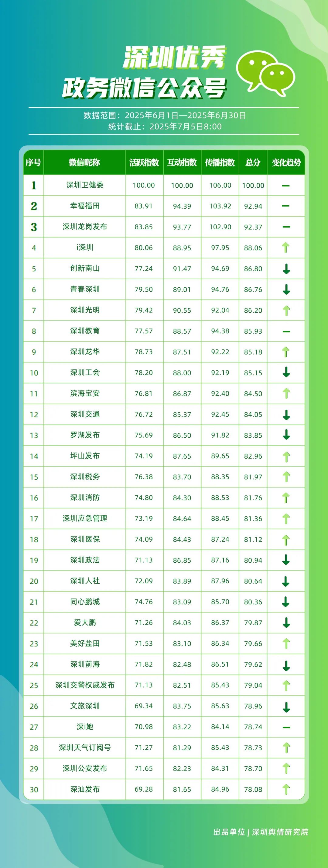 6月,30个政务微信公众号入选“深圳优秀政务微信公众号”榜单,其中包括“深圳卫健委”“幸福福田”“深圳龙岗发布”“i深圳”“创新南山”“青春深圳”“深圳光明”“深圳教育”“深圳龙华”“深圳工会”等。6月,榜单前三名的账号保持稳定,且各创作出多篇阅读量超10万次的优质文章,传播指数得分均在100分以上。“深圳卫健委”持续位居榜首,内容专业性与传播力持续领跑;“幸福福田”以92.94分位居第二,得分较5月有所提高。“深圳龙岗发布”“i深圳”“创新南山”也积极发布民生服务与宣传活动内容,排名靠前。上榜账号整体呈现“内容精品化、服务场景化”特点,持续优化信息供给质量,为用户打造有深度的政务信息服务矩阵。