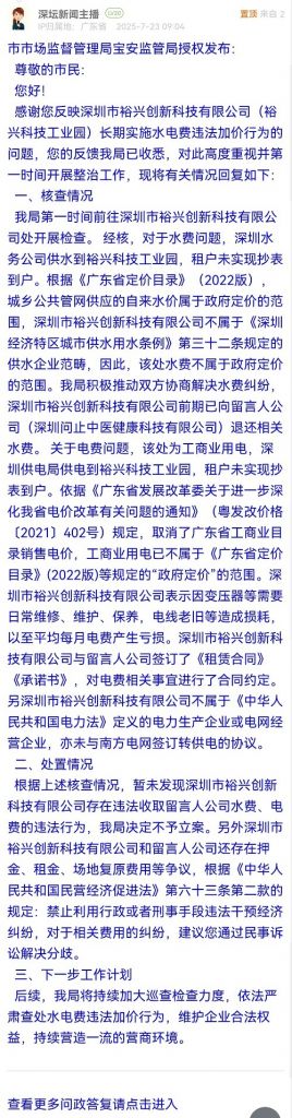 感谢您反映深圳市裕兴创新科技有限公司(裕兴科技工业园)长期实施水电费违法加价行为的问题,您的反馈我局已收悉,对此高度重视并第一时间开展整治工作,现将有关情况回复如下: