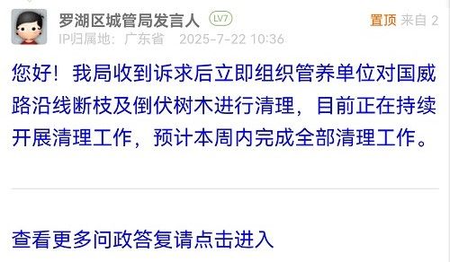 您好!我局收到诉求后立即组织管养单位对国威路沿线断枝及倒伏树木进行清理,目前正在持续开展清理工作,预计本周内完成全部清理工作。