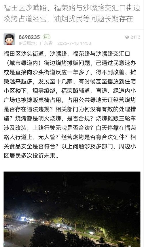 22. 帖文《福田区沙嘴路、福荣路与沙嘴路交汇口街边烧烤占道经营,油烟扰民等问题长期存在》