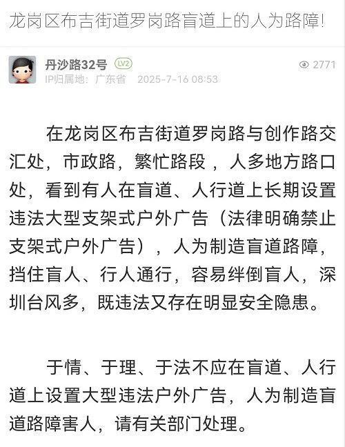 14. 帖文《龙岗区布吉街道南环路盲道上的人为路障!》