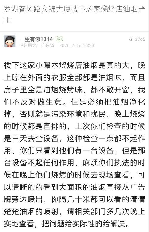33. 帖文《罗湖春风路文锦大厦楼下这家烧烤店油烟严重》