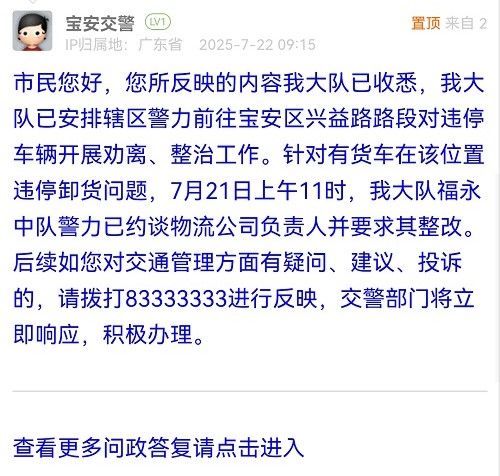 市民您好,您所反映的内容我大队已收悉,我大队已安排辖区警力前往宝安区兴益路路段对违停车辆开展劝离、整治工作。针对有货车在该位置违停卸货问题,7月21日上午11时,我大队福永中队警力已约谈物流公司负责人并要求其整改。后续如您对交通管理方面有疑问、建议、投诉的,请拨打83333333进行反映,交警部门将立即响应,积极办理。