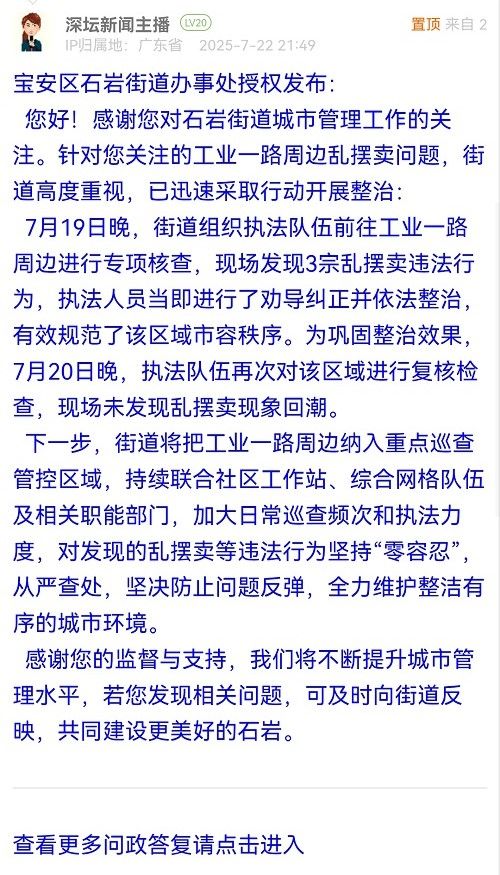 感谢您的监督与支持,我们将不断提升城市管理水平,若您发现相关问题,可及时向街道反映,共同建设更美好的石岩。
