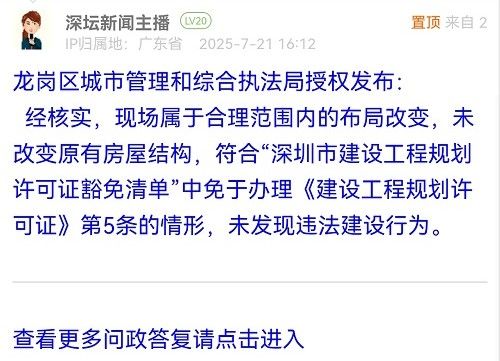 经核实,现场属于合理范围内的布局改变,未改变原有房屋结构,符合“深圳市建设工程规划许可证豁免清单”中免于办理《建设工程规划许可证》第5条的情形,未发现违法建设行为。