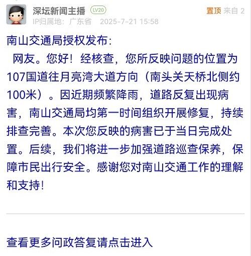 网友。您好!经核查,您所反映问题的位置为107国道往月亮湾大道方向(南头关天桥北侧约100米)。因近期频繁降雨,道路反复出现病害,南山交通局均第一时间组织开展修复,持续排查完善。本次您反映的病害已于当日完成处置。后续,我们将进一步加强道路巡查保养,保障市民出行安全。感谢您对南山交通工作的理解和支持!