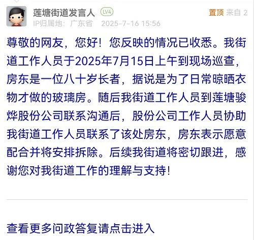 尊敬的网友,您好!您反映的情况已收悉。我街道工作人员于2025年7月15日上午到现场巡查,房东是一位八十岁长者,据说是为了日常晾晒衣物才做的玻璃房。随后我街道工作人员到莲塘骏烨股份公司联系沟通后,股份公司工作人员协助我街道工作人员联系了该处房东,房东表示愿意配合并将安排拆除。后续我街道将密切跟进,感谢您对我街道工作的理解与支持!
