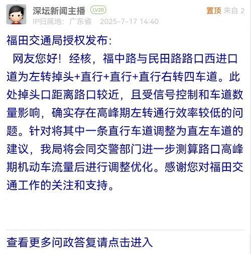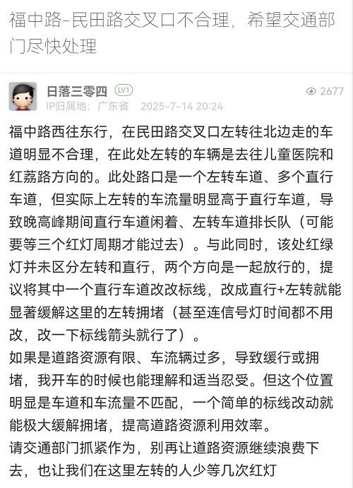 6. 帖文《福中路-民田路交叉口不合理,希望交通部门尽快处理》